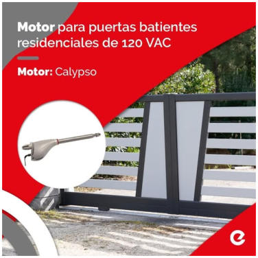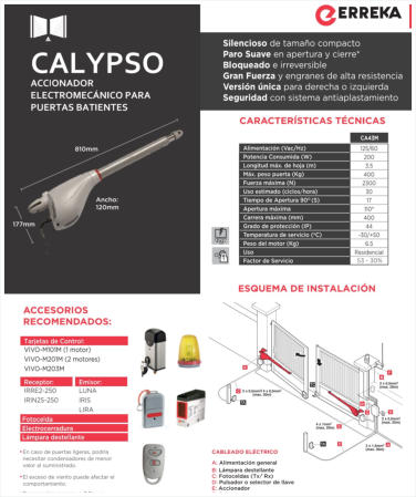 Kit Portones hasta 7.00 m de ancho y 350 kg de peso por hoja (2 hojas)ERREKA - CALYPSO 2BRAZOS STANDAR DE 40 CMS Incluye 2 Controles remotos LIRA, tarjeta de control, 12 m de cable de uso rudo, herrajes e instalaciòn.Indicado para uso residencial o fraccionamientos con portones anchos y pesados.30 usos por hora. Abre en 20 segundos