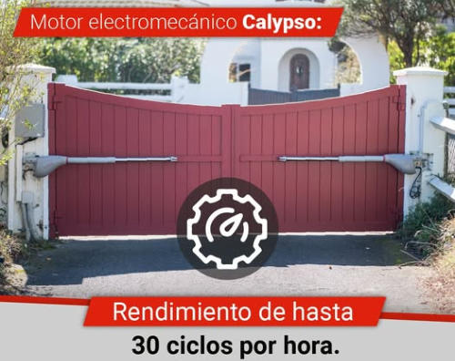 Especificaciones Técnicas:CALYPSO es un motor fuerte y silencioso que lo hace adecuado para FRACCIONAMIENTOS - CONDOMINIOS - CLUSTERS - PRIVADAS.Especial para puertas grandes y pesadas•Alimentación 127Vac.•Fuerza máxima 2300N.•Velocidad de apertura 23mm/s.•Bloqueado.•Apertura máxima de 110 grados•Grado de protección IP44.•Carrera: brazo corto 400mm y brazo largo 500mm•Utilizable en todo tipo de temperaturas entre -30º/+50º.•Posición protegida del cable de alimentación.•Desaceleración electrónica en apertura y cierre.•Tarjeta de memoria de radiofrecuencia con capacidad hasta 500 controles remotos•Admite controles remotos LIRA e IRIS. Los dos son de código rolante•Puede abrir y cerrar las 2 hojas o puede abrir y cerrar solo una hoja.•Los dos parámetros funcionan a la vez•Se puede programar cierre automático de las puertas de acuerdo al tiempo de espera que se considere conveniente•Cuenta con llaves de desbloqueo para los brazos en caso de que así lo requiera•Se recomienda incorporarle accesorios como: chapa de seguridad a piso, fotoceldas, luz estroboscópica.•Cuentan con paro suave (se frenan antes de llegar al tope de apertura y cierre)