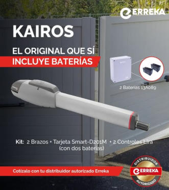 KIT BÁSICO KAIROS 2 HOJAS - ERREKA PARA FRACCIONAMIENTOS CONSTA DE:1 Tarjeta de Control modelo SMART D201M con gabinete especial para estar a la intemperie1 Receptor de señales de radiofrecuencia integrada en la Tarjeta de Control2 pistones con motor de 3000 N con llaves de desbloqueo2 Controles remotos modelo LIRA2 baterías de 12 Vcd armadas en serie suministran 24 VcdHerrajes para la instalación12 m de cable uso rudo 2x16 de cobre al 100%Instalación con cableado aparente18 meses de garantía contra defectos de fábrica